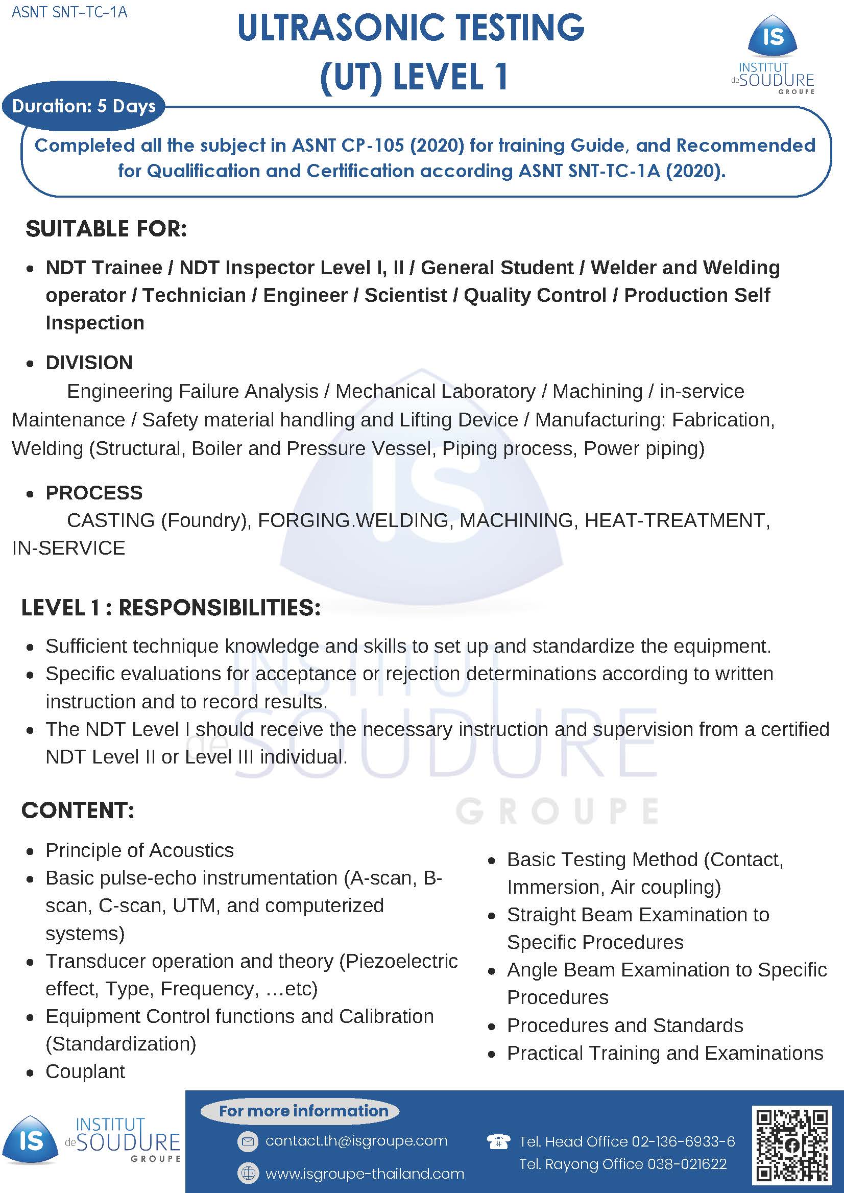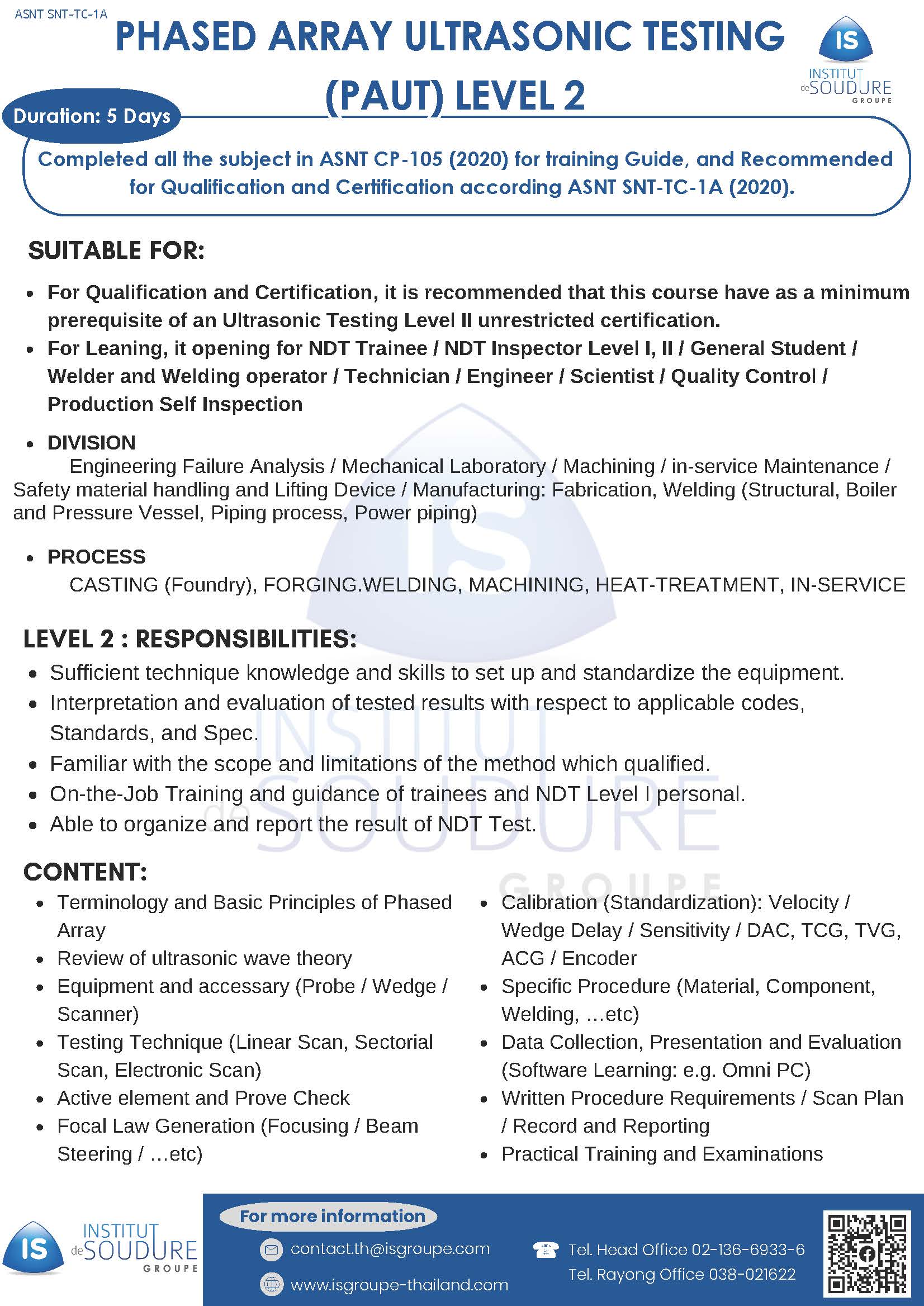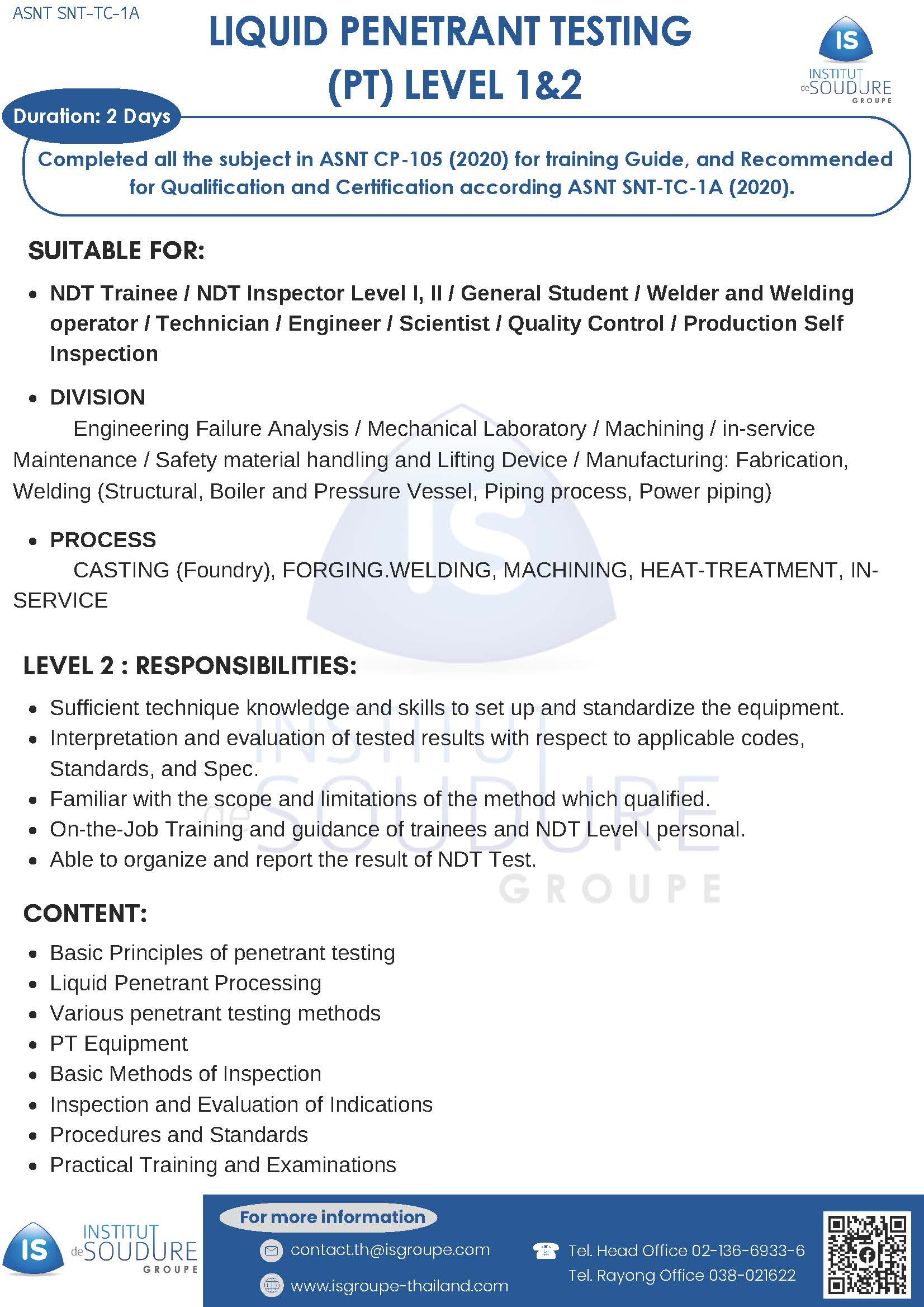 Institut de Soudure Thailand develops its training courses according to the needs of industrial companies and professional technicians with various training courses by recognised certified instructors.